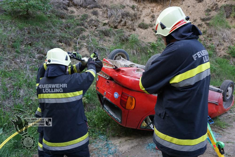 Ein Pkw kam von der Straße ab, verunfallte in den ca. 3m tieferen Löllinger Bach und kam auf den Rädern zum Stehen.
